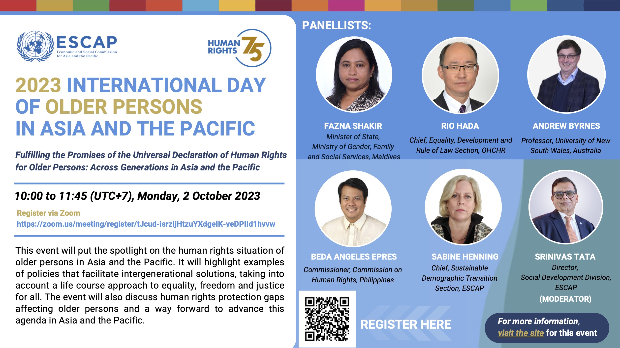 This event will put the spotlight on the human rights situation of older persons in Asia and the Pacific and highlight examples of policies that facilitate intergenerational solutions, taking into account a life course approach to equality, freedom and justice for all. The event will also discuss human rights protection gaps affecting older persons and a way forward to advance this agenda in Asia and the Pacific.