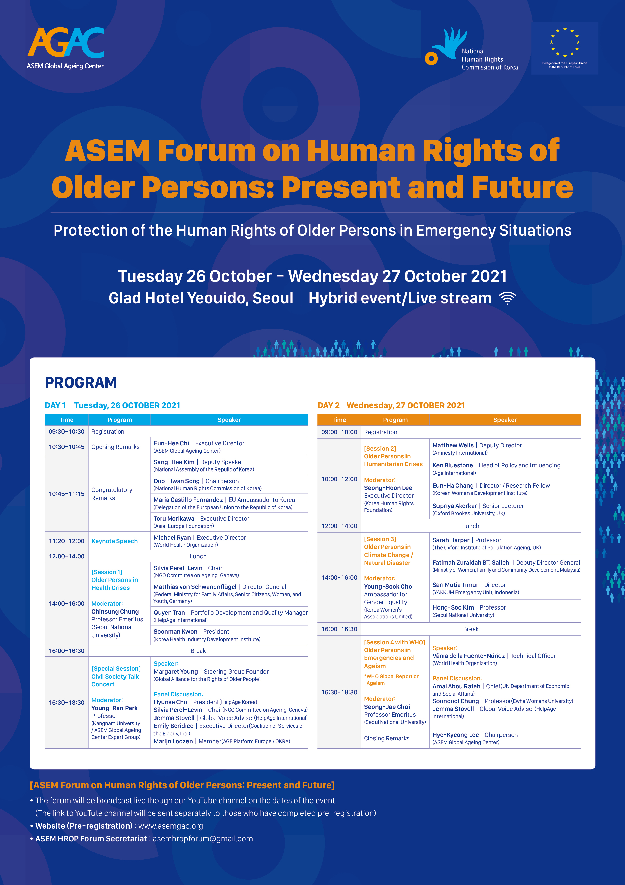 To disseminate this report more widely, the ASEM Global Ageing Center (AGAC) published its Korean translation during the ASEM Forum on Human Rights of Older Persons. The theme of the forum was Protection of the Human Rights of Older Persons in Emergency Situations, and Session 4 of the forum marked the publication of the Korean translation of the report.