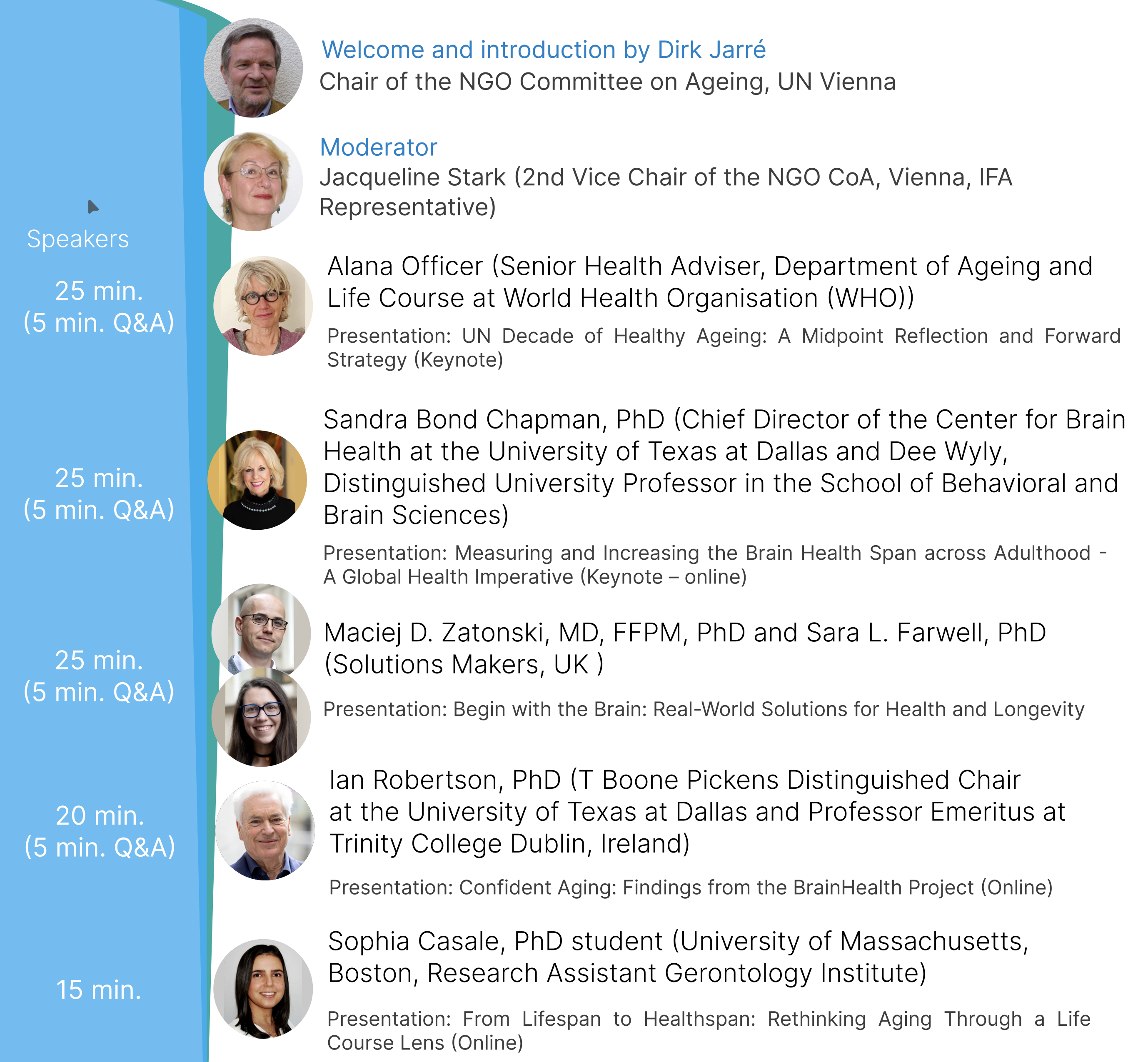 Halfway through the “Decade of Healthy Ageing”, global experts on ageing will address the central role of the brain in maintaining one’s health and quality of life. The opportunities and challenges for older people for a healthy life across the life span will be explored from various perspectives.