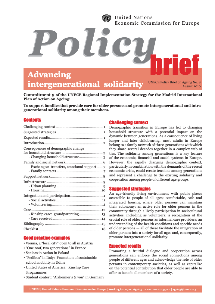 Demographic transition in Europe has led to changing household structure with a potential impact on the dynamic between generations. As a consequence of living longer and later childbearing, most adults in Europe belong to a family network of three generations with which they share several decades together in a complex web of ties. The solidarity among generations is a key feature of the economic, financial and social systems in Europe. However, the rapidly changing demographic context, particularly in combination with the demands of the recent economic crisis, could create tensions among generations and represent a challenge to the existing solidarity and cooperation among people of different age groups.