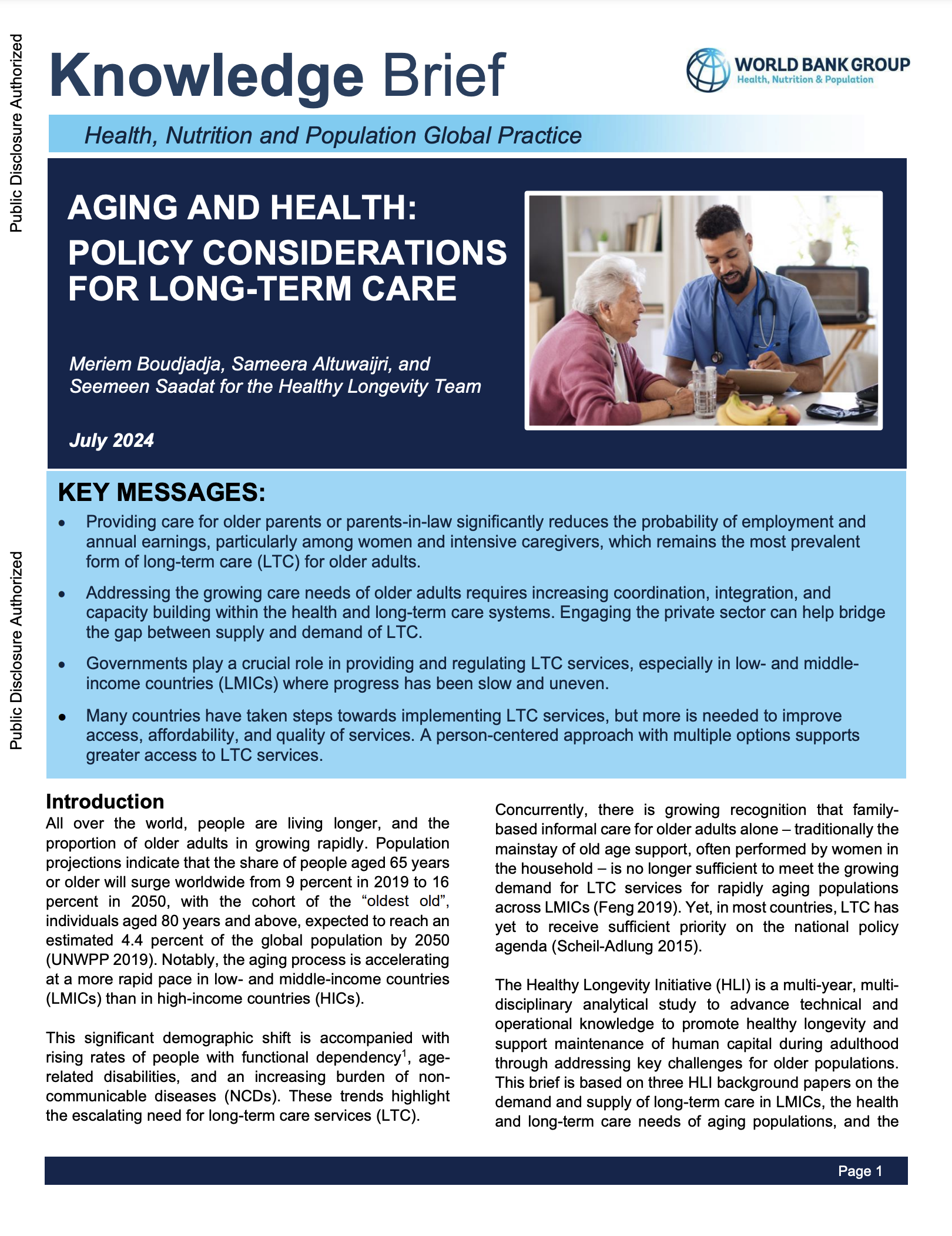 Providing care for older parents or parents-in-law significantly reduces the probability of employment and annual earnings, particularly among women and intensive caregivers, which remains the most prevalent form of long-term care (LTC) for older adults. Addressing the growing care needs of older adults requires increasing coordination, integration, and capacity building within the health and long-term care systems. Engaging the private sector can help bridge the gap between supply and demand of LTC. Governments play a crucial role in providing and regulating LTC services, especially in low- and middle-income countries (LMICs) where progress has been slow and uneven. Many countries have taken steps towards implementing LTC services, but more is needed to improve access, affordability, and quality of services. A person-centered approach with multiple options supports greater access to LTC services.