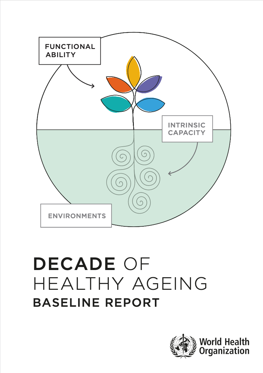 The Baseline Report for the Decade of Healthy Ageing 2021−2030 addresses five issues: 1) Introduces Healthy Ageing, the Decade’s actions and enablers, and a pathway to accelerate impact by 2030; 2) Where are we in 2020? The report provides a first-time baseline for healthy ageing worldwide; 3) What improvements could we expect by 2030? It documents progress and scenarios for improvement; 4) How can we accelerate impact on the lives of older people? It shows how older people and stakeholders can together optimize functional ability; 5) The next steps including opportunities to boost collaboration and impact by 2023, the next reporting period.