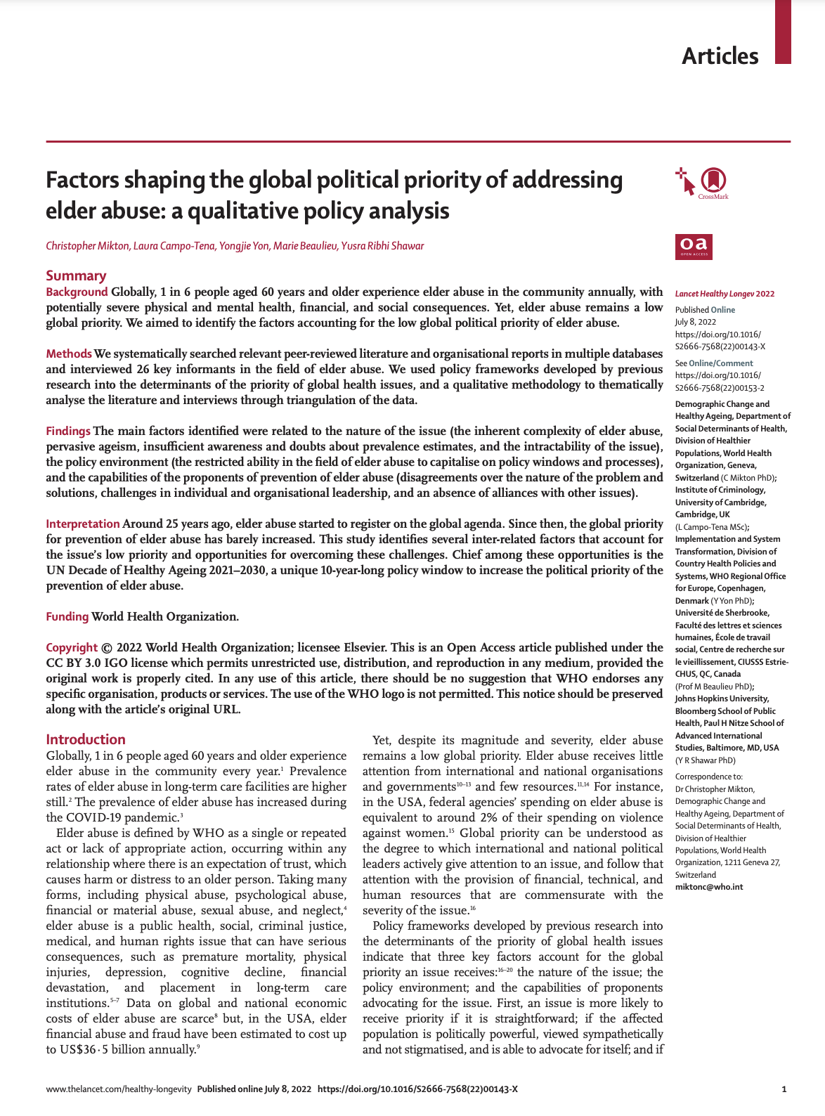 Globally, 1 in 6 people aged 60 years and older experience elder abuse in the community annually, with potentially severe physical and mental health, financial, and social consequences. Yet, elder abuse remains a low global priority. We aimed to identify the factors accounting for the low global political priority of elder abuse. We systematically searched relevant peer-reviewed literature and organisational reports in multiple databases and interviewed 26 key informants in the field of elder abuse. In this paper, we used policy frameworks developed by previous research into the determinants of the priority of global health issues, and a qualitative methodology to thematically analyse the literature and interviews through triangulation of the data. The main factors identified were related to the nature of the issue (the inherent complexity of elder abuse, pervasive ageism, insufficient awareness and doubts about prevalence estimates, and the intractability of the issue), the policy environment (the restricted ability in the field of elder abuse to capitalise on policy windows and processes), and the capabilities of the proponents of prevention of elder abuse (disagreements over the nature of the problem and solutions, challenges in individual and organisational leadership, and an absence of alliances with other issues). Around 25 years ago, elder abuse started to register on the global agenda. Since then, the global priority for prevention of elder abuse has barely increased. This study identifies several inter-related factors that account for the issue's low priority and opportunities for overcoming these challenges. Chief among these opportunities is the UN Decade of Healthy Ageing 2021–2030, a unique 10-year-long policy window to increase the political priority of the prevention of elder abuse.