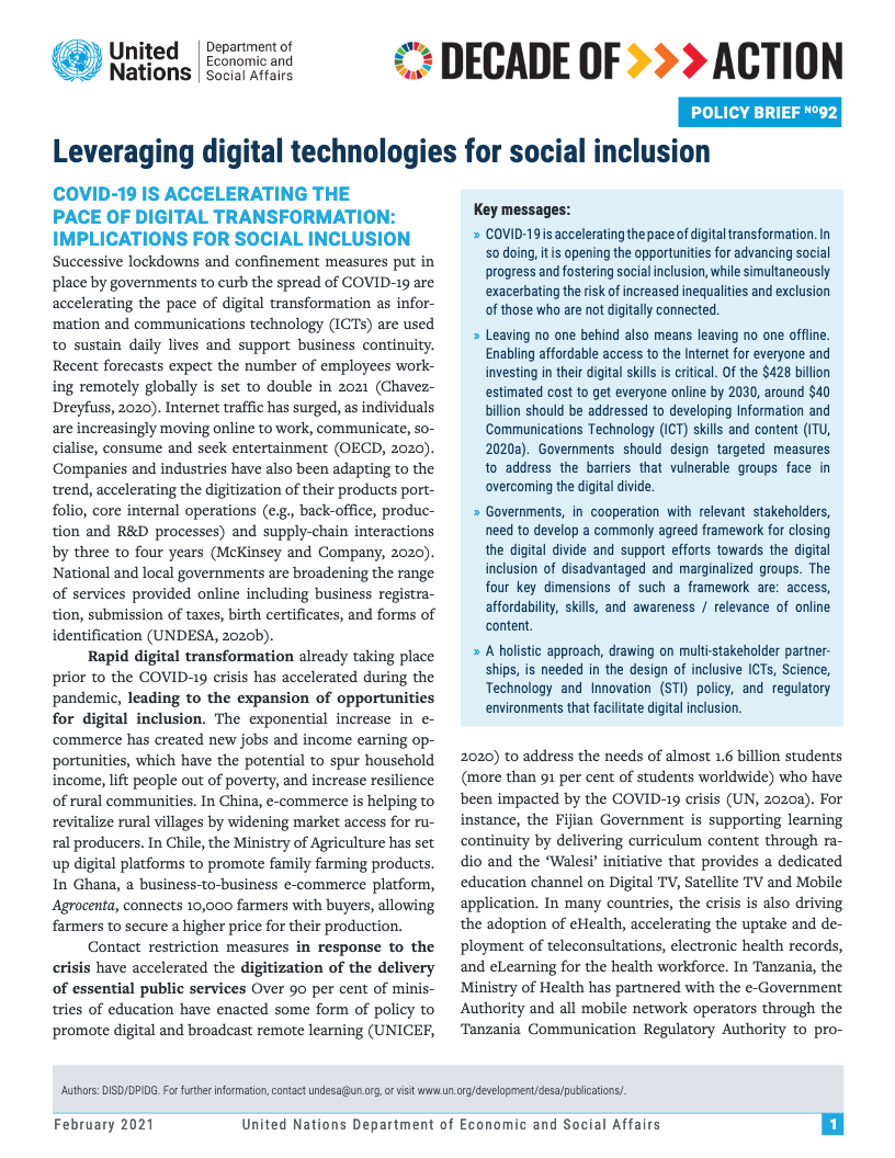 COVID-19 is accelerating the pace of digital transformation. In so doing, it is opening the opportunities for advancing social progress and fostering social inclusion, while simultaneously exacerbating the risk of increased inequalities and exclusion of those who are not digitally connected. Leaving no one behind also means leaving no one offline. Enabling affordable access to the Internet for everyone and investing in their digital skills is critical. Of the $428 billion estimated cost to get everyone online by 2030, around $40 billion should be addressed to developing Information and Communications Technology (ICT) skills and content. Governments should design targeted measures to address the barriers that vulnerable groups face in overcoming the digital divide. Governments, in cooperation with relevant stakeholders, need to develop a commonly agreed framework for closing the digital divide and support efforts towards the digital inclusion of disadvantaged and marginalized groups. The four key dimensions of such a framework are: access, affordability, skills, and awareness / relevance of online content. A holistic approach, drawing on multi-stakeholder partner-ships, is needed in the design of inclusive ICTs, Science, Technology and Innovation (STI) policy, and regulatory environments that facilitate digital inclusion.
