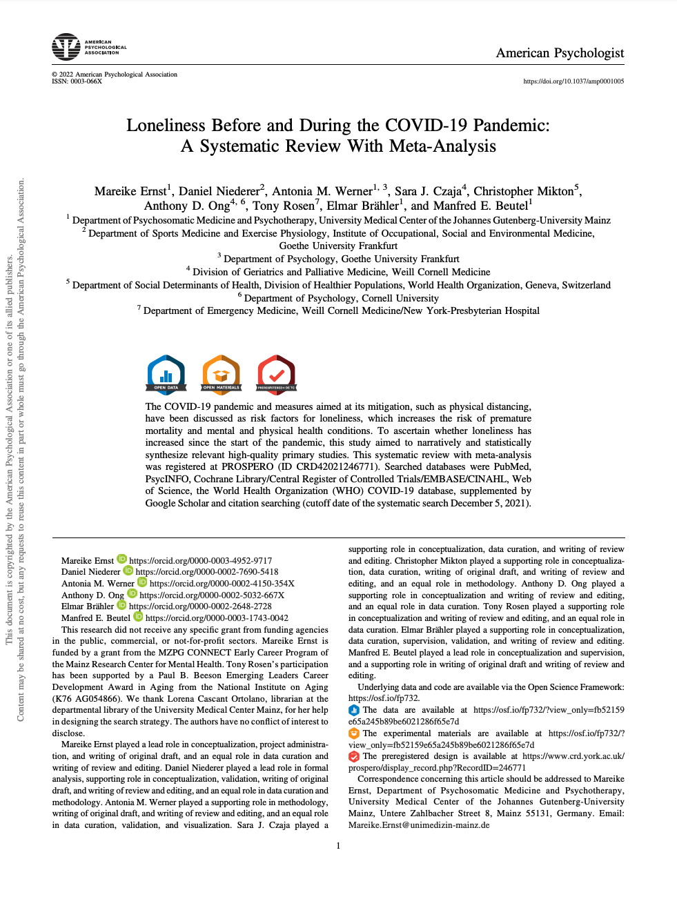 The COVID-19 pandemic and measures aimed at its mitigation, such as physical distancing, have been discussed as risk factors for loneliness, which increases the risk of premature mortality and mental and physical health conditions. To ascertain whether loneliness has increased since the start of the pandemic, this study aimed to narratively and statistically synthesize relevant high-quality primary studies. To figure out whether the pandemic actually increased loneliness, the researchers reviewed 34 studies from four continents—primarily in North America and Europe—involving more than 200,000 total participants. All of the data came from long-term studies that measured participants’ levels of loneliness before the onset of the pandemic and again during the pandemic. The researchers found a small but significant increase in loneliness during the pandemic—about a 5 percent increase in the prevalence of loneliness across the individual studies, on average. However, not all groups experienced that increase. More research is needed on the factors that put some individuals and groups at higher risk of experiencing loneliness, whether the changes in loneliness were primarily due to alterations in the quality or the quantity of people’s social interactions, and whether those differed across subpopulations, such as students and older adults. Such studies could help researchers develop better targeted interventions to increase people’s amount of social interaction or to improve the quality of their close relationships.