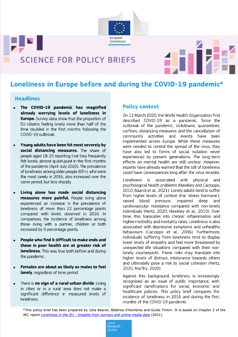 On 11 March 2020, the World Health Organization first described COVID-19 as a pandemic. Since the outbreak of the pandemic, lockdowns, quarantines, curfews, distancing measures and the cancellation of community activities and events have been implemented across Europe. While these measures were needed to control the spread of the virus, they have also led to forms of social isolation never experienced by present generations. The long-term effects on mental health are still unclear. However, experts have already warned that the toll of loneliness could have consequences long after the virus recedes. Against this background, loneliness is increasingly recognised as an issue of public importance, with significant ramifications for social, economic and healthcare policies. This policy brief compares the incidence of loneliness in 2016 and during the first months of the COVID-19 pandemic. The purpose is to identify the socio-demographic characteristics frequently linked with loneliness, and examine whether the risks factors associated with loneliness changed after the outbreak of the pandemic. Therefore, this analysis contributes to assess the potential consequences for the population of extended periods of forced social isolation. The ultimate goal is to support the design of targeted and effective intervention strategies.
