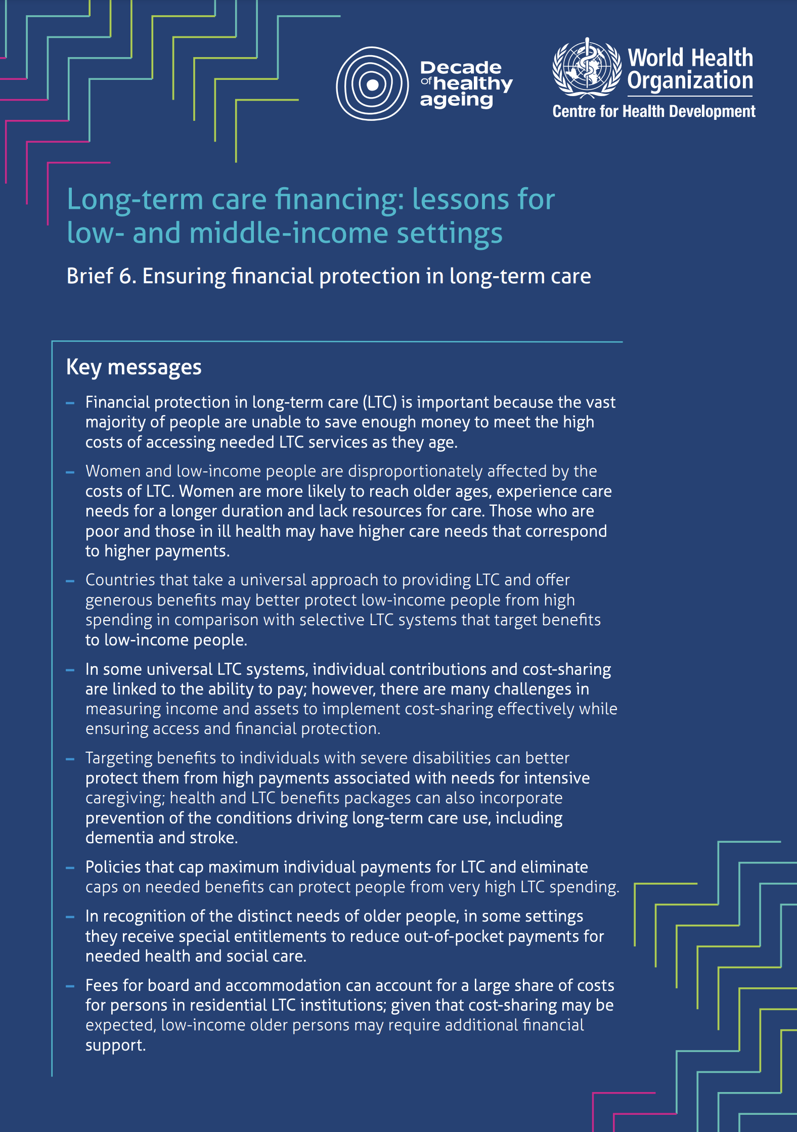 The WHO Centre for Health Development (WHO Kobe Centre – WKC) has produced a series of research briefs on financing long-term care (LTC) which translate research evidence to guide policy-makers on designing and financing LTC in low- and middle-income countries. Brief 6 in the series, Financing health and social long-term care: lessons for low- and middle-income countries (LMICs), addresses how countries can ensure financial protection in LTC.