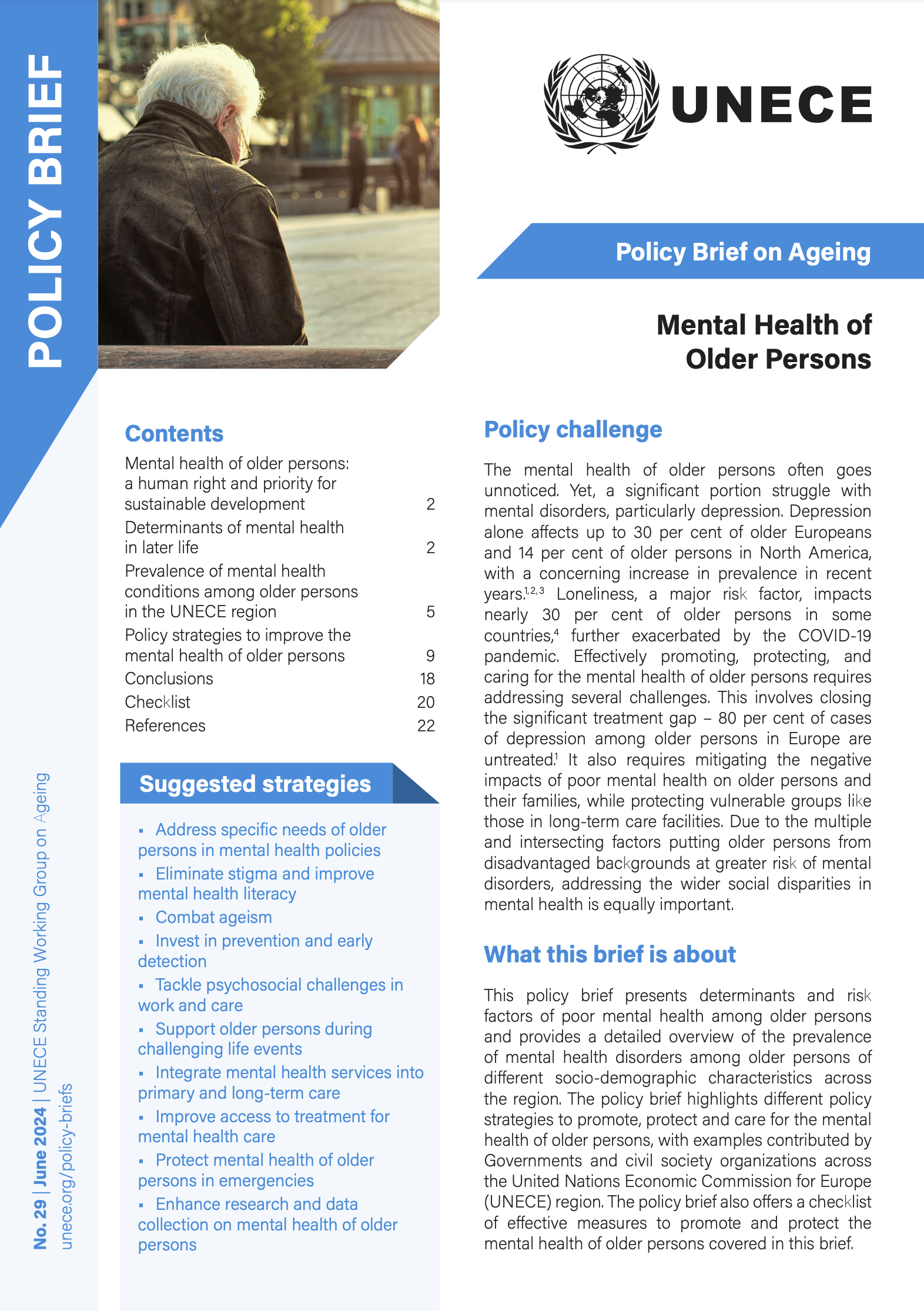 A significant portion of older individuals experience mental disorders. Yet, these often go unnoticed and untreated, being overlooked as normal ageing or overshadowed by other health issues. This is especially true for older women, those with lower socio-economic status, and long-term care facility residents. To effectively promote and protect the mental health of older adults, addressing the treatment gap and the negative impacts on individuals and their families is crucial. This policy brief outlines the determinants and prevalence of mental health issues among older adults in the UNECE region and features concrete policy strategies and examples aimed at improving mental health of older persons from across the UNECE region. The policy examples featured in the brief include measures to eliminate stigma, improve mental health literacy and combat ageism. They also include measures aimed at prevention and early detection, tackling psychosocial challenges and supporting older persons during challenging life events. Furthermore, the brief includes policy examples for integrating mental health services into care, improving access to treatment, protecting mental health in emergencies, and enhancing research and data collection.