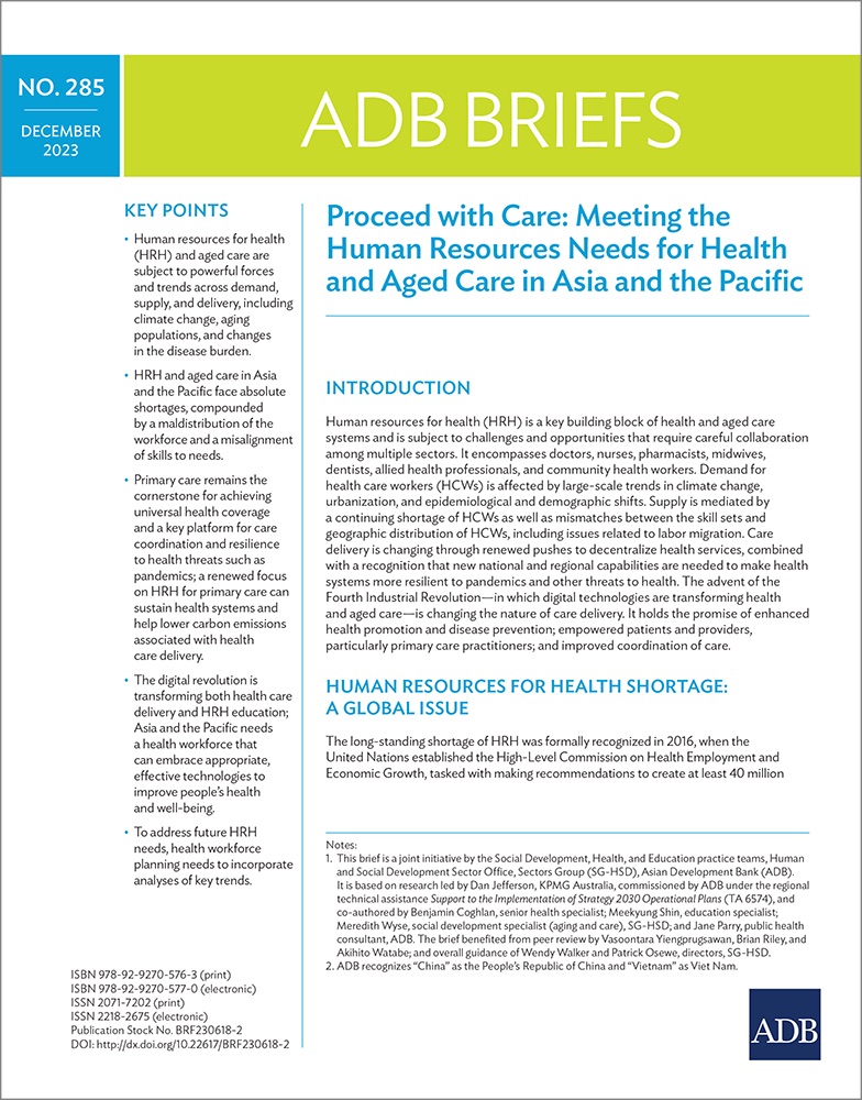 This brief illustrates how improving health and aged care in Asia and the Pacific hinges on tackling the shortage of trained staff, better analyzing key trends, and harnessing the digital technologies needed to build resilient systems. The brief looks at changing demographics, high rates of noncommunicable diseases, and the impact of the pandemic. It considers the effects of migration and the challenge of attracting workers to underserved areas. It sets out how a more integrated approach that focuses on gender and climate, supports the most vulnerable systems, and exploits digital health solutions can help meet the region’s current and future needs.