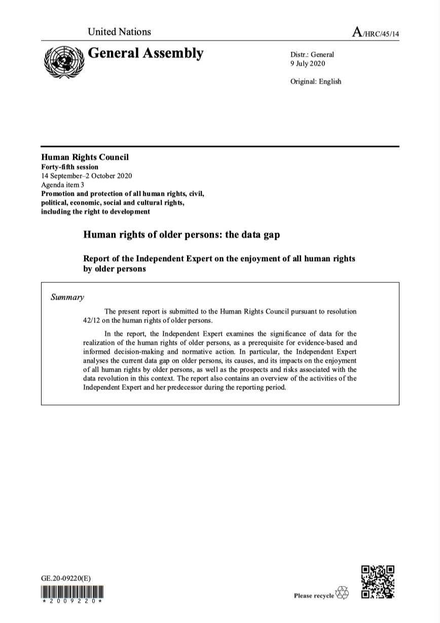 The present report was submitted to the Human Rights Council pursuant to resolution 42/12 on the human rights of older persons. In the report, the Independent Expert on the enjoyment of all human rights by older persons examines the significance of data for the realization of the human rights of older persons, as a prerequisite for evidence-based and informed decision-making and normative action. In particular, the Independent Expert analyses the current data gap on older persons, its causes, and its impact on the enjoyment of all human rights by older persons, as well as the prospects and risks associated with the data revolution in this context. The report also contains an overview of the activities of the Independent Expert and her predecessor during the reporting period.