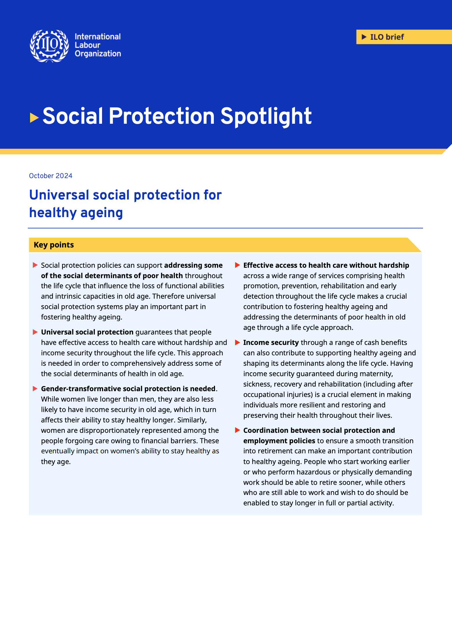 This instalment of the Social Protection Spotlight brief series from the International Labour Organization explores the role of universal social protection in promoting healthy ageing, reducing disease and disability among older persons by ensuring equitable access to healthcare, pensions, and long-term care services.