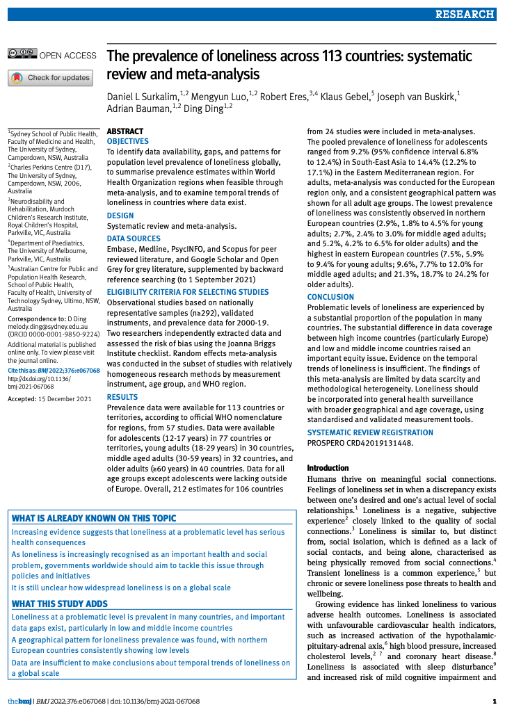 The objective of this systematic review and meta-analysis was to identify data availability, gaps, and patterns for population level prevalence of loneliness globally, to summarise prevalence estimates within World Health Organization regions when feasible through meta-analysis, and to examine temporal trends of loneliness in countries where data exist. It found that problematic levels of loneliness are experienced by a substantial proportion of the population in many countries. The substantial difference in data coverage between high income countries (particularly Europe) and low and middle income countries raised an important equity issue. Evidence on the temporal trends of loneliness is insufficient. The findings of this meta-analysis are limited by data scarcity and methodological heterogeneity. Loneliness should be incorporated into general health surveillance with broader geographical and age coverage, using standardised and validated measurement tools.