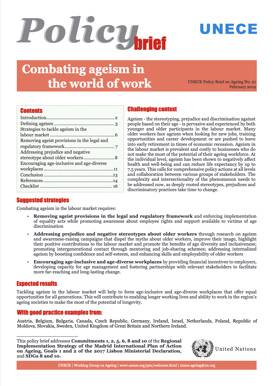 Ageism is the stereotyping, prejudice and discrimination against people based on their age. Many older workers face ageism when looking for new jobs, training opportunities and career development or are pushed to leave into early retirement in times of economic recession. Ageism in the labour market is costly to businesses who do not make the most of their ageing workforce. At the individual level, ageism has been shown to negatively affect health and well-being. The complexity and intersectionality of the phenomenon needs to be addressed now. Deeply rooted stereotypes, prejudices and discriminatory practices take time to change. Combating ageism in the world of work requires removing ageist provisions in the legal and regulatory framework, addressing prejudice and negative stereotypes about older workers and encouraging age-inclusive and age-diverse workplaces that offer equal opportunities for all generations.