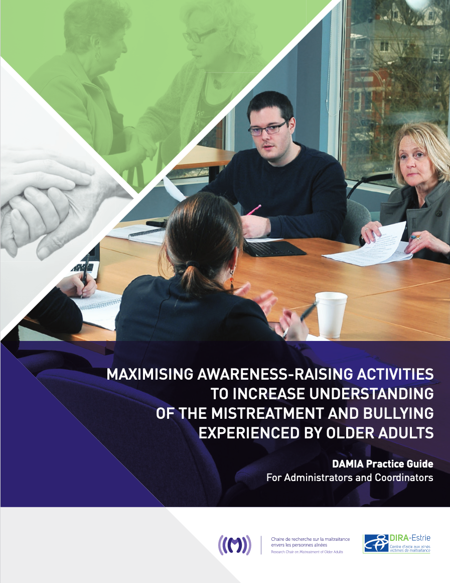 The DAMIA (Request for Assistance in the Context of Elder Abuse and Bullying) practice guide aims to develop and maximise awareness-raising practice in relation to elder abuse and bullying. The first booklet, Maximising Awareness-raising Activities to Increase Understanding of the Mistreatment and Bullying Experienced by Older Adults, provides general information on elder abuse and bullying and suggests concrete actions for the development, planning and facilitation of awareness activities. The second booklet is entitled: Animating Awareness-raising Activities to Counter Mistreatment and Bullying of Older Adults. This second booklet offers information and concrete guidelines to prepare and support those who lead awareness-raising activities on elder abuse and bullying. These two booklets are available in French and English.