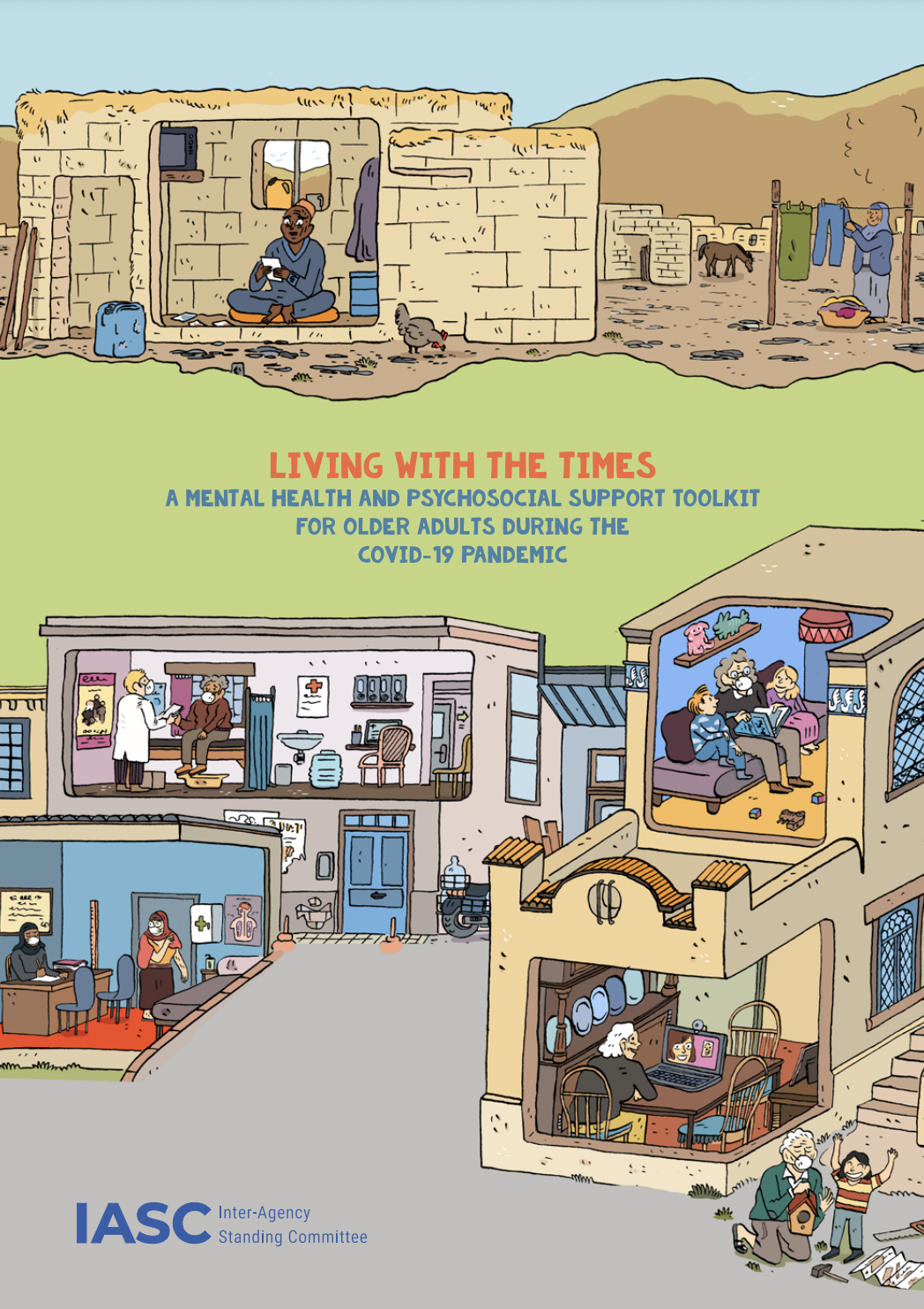 The coronavirus disease (COVID-19) pandemic has severely affected the mental health and well-being of older people. As a high-risk group for severe disease and mortality, older people had to be especially cautious to avoid contracting the virus. Adherence to public health and social measures left them facing extended periods of social isolation, interrupted care services and exclusion from societal life. Living with the Times is a mental health and psychosocial support toolkit developed by the Inter-Agency Standing Committee Reference Group on Mental Health and Psychosocial Support in Emergency Settings (IASC MHPSS RG), co-chaired by the World Health Organization and the International Federation of Red Cross and Red Crescent Societies. The toolkit specifically addresses the coping needs of older people during the pandemic. It contains five large posters and an instruction manual for caregivers that can be printed out or used on screen.