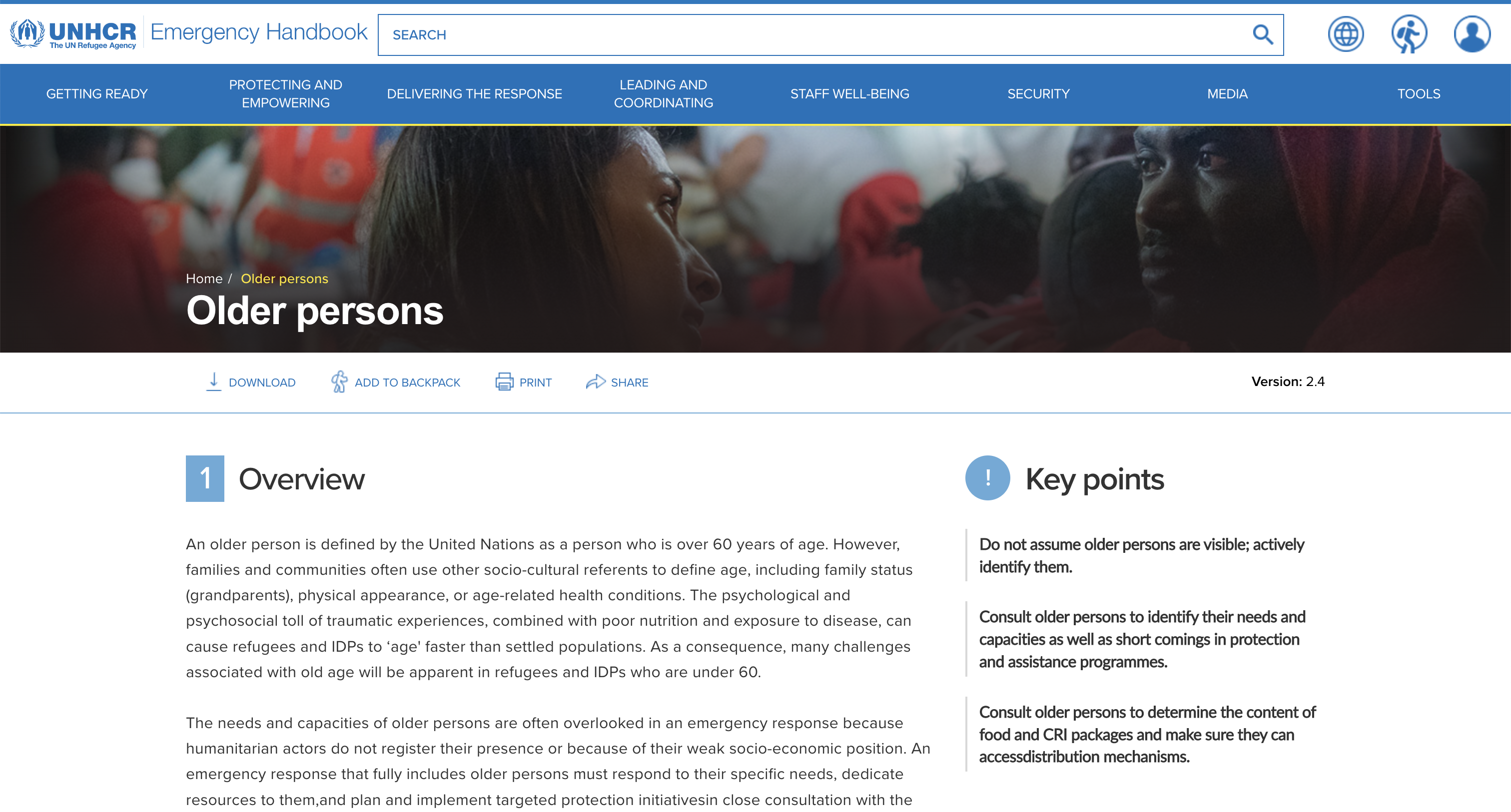 This is a section dedicated to older persons taken from UNHCR’s Handbook for Emergencies, whose 4th edition was originally published in 2015 but is now available fully online and constantly updated. The Emergency Handbook guidance is published in the form of “Entries”, self-contained units of content. Entries are structured along seven main topic areas: 1. “Getting ready”: Emergency preparedness; 2. “Protecting and empowering”: Community based protection; protection interventions, asylum, specific needs, registration, legal standards and principles; 3. “Delivering the response”: Programme planning and management, sector guidance and good practises by operational context (urban, rural, camps), standards and indicators, UNHCR management procedures for administration, finance, human resources, supply and information and communication technology (ICT); 4. “Leading and coordinating”: Setting strategy, coordination, emergencies, resource mobilisation and information management; 5. “Staff well-being”: Support and advice for emergency responders, also in terms of psychological and physical well-being; 6. “Security”: Security and risk management guidance, in view of emergency responders and persons of concern; 7. “Media”: Working with journalists and mass media, including print, visual and digital media.