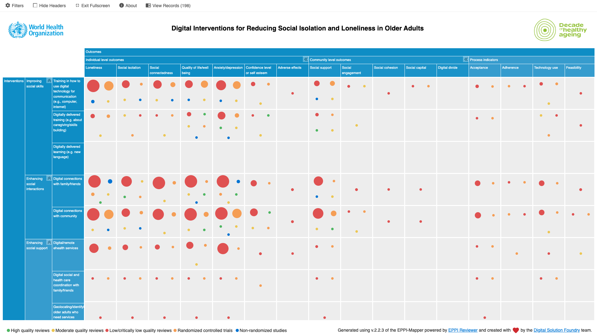 Evidence and gap maps are interactive tools that help researchers and decision makers discover existing evidence on a given topic, find solutions supported by evidence, and identify gaps in the evidence where more research is required. The World Health Organization is developing evidence and gap maps as part of a multi-year project to summarise, disseminate, and increase uptake of evidence towards deeper integration in policies and practices during the UN Decade of Healthy Ageing. This evidence and gap map examines the evidence on digital interventions to reduce social isolation and loneliness in older adults.