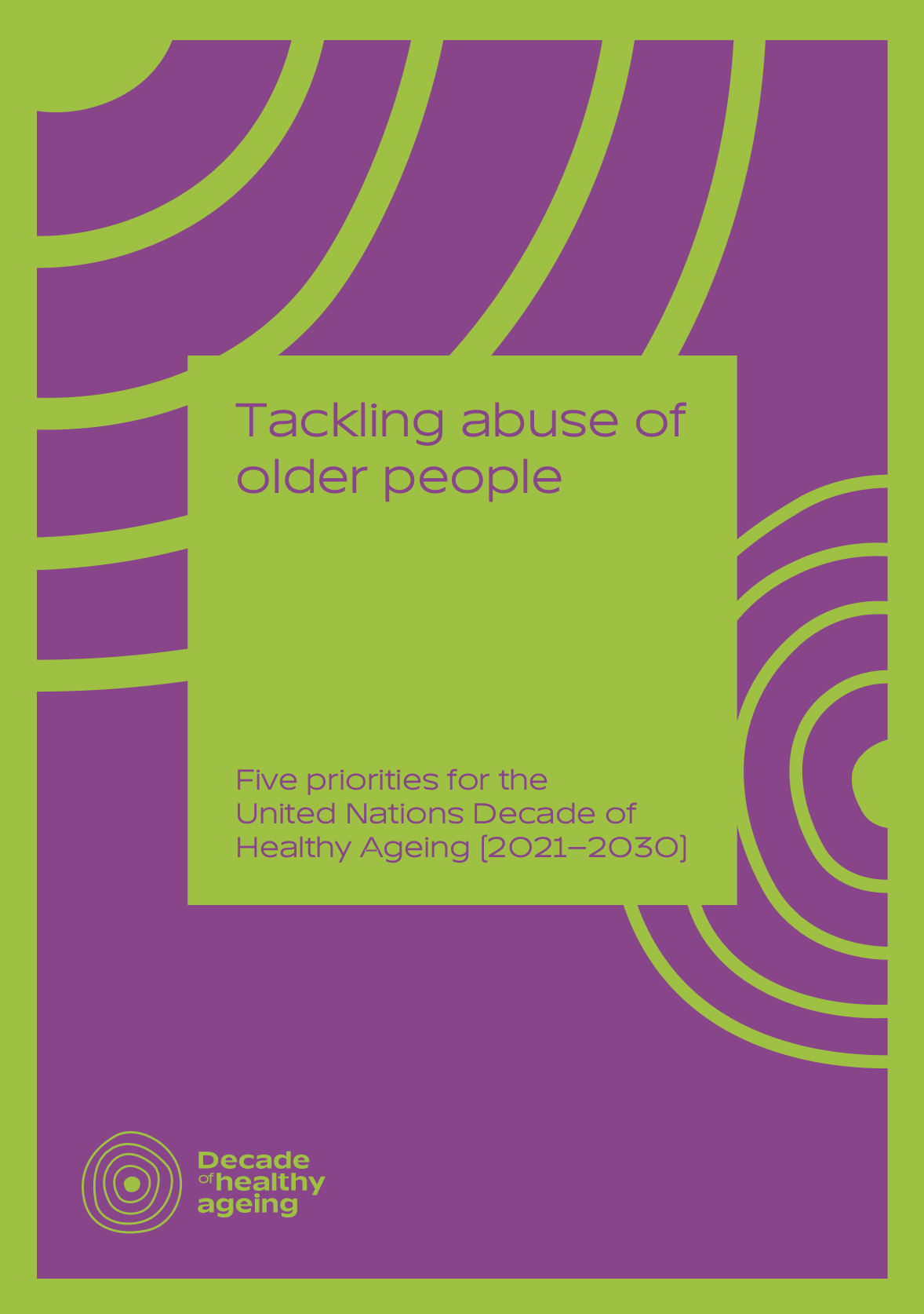 Globally 1 in 6 people aged 60 years and older experience abuse in the community every year. Rates in institutions are even higher. Yet, abuse of older people, also known as elder abuse, remains a low global priority. The UN Decade of Healthy Ageing 2021–2030 offers a unique 10-year opportunity for a step change in how abuse of older people is tackled. This document outlines five priorities to prevent and respond to abuse of older people: (1) combat ageism; (2) generate more and better data on prevalence and on risk and protective factors; (3) develop and scale up cost–effective solutions; (4) make an investment case for addressing the issue; and (5) raise funds to tackle the issue. If governments, United Nations agencies and development organizations, civil society organizations, academic and research institutions and funders implement these priorities, we can reduce the number of older people worldwide who experience abuse and contribute to improving their health, well-being and dignity.