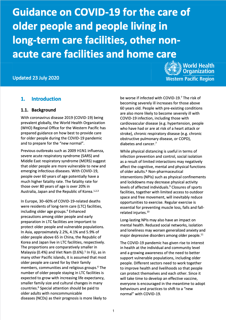 In response to the COVID-19 outbreak, this guidance provides information on infection and prevention control (IPC), community preparedness, selfcare for wellbeing, and preparation for the "new normal". This guidance is for older people, their friends and families, caregivers, healthcare providers, long-term care (LTC) providers and community/regional/national leaders. A facility where older people receive care (including LTC facilities, non-acute care facilities, home care services, etc.) should practice IPC and prevent social isolation of older people. Communities should continue to provide integrated care to support older people. Regional and national leaders should strengthen their efforts in the "new normal" for older people by promoting self-care, use of IT, community-based care and age-friendly environment. These will create the foundation for "new future", beyond the COVID-19 pandemic, where communities recognize people's health as an integral infrastructure, and are supporting older people to stay healthy, thrive, and age-in-place.