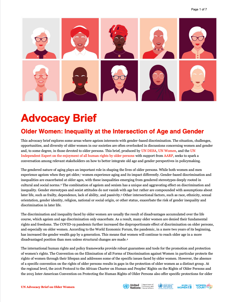 This advocacy brief explores some areas where ageism intersects with gender-based discrimination. The gendered nature of aging plays an important role in shaping the lives of older persons. While both women and men experience ageism when they get older, women experience aging and its impact differently. Gender-based discrimination and inequalities are exacerbated at older ages, with these inequalities emerging from gendered stereotypes deeply rooted in cultural and social norms. The combination of ageism and sexism has a unique and aggravating effect on discrimination and inequality. The situation, challenges, opportunities, and diversity of older women in our societies are often overlooked in discussions concerning women and gender and, to some degree, in those devoted to older persons. This brief seeks to spark a conversation among relevant stakeholders on how to better integrate old age and gender perspectives in policymaking.
